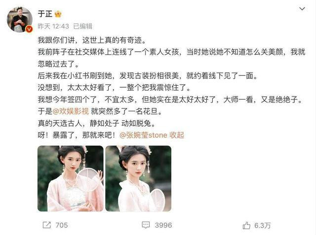 2024年12月,于正晒照官宣新签约素人美女张婉莹,大赞对方外貌“真的天选古人,静如处子动如脱兔”。随即有网友发现该女生曾是一名河南某高校教师。