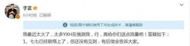 15日,于正发文称:“七七已经联络上了,但还没有见到,有后续会告诉大家。”